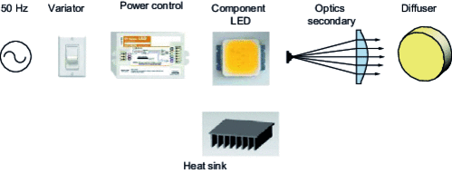 An LED lighting device is a complex assembly of different sub-assemblies that can be treated independently, from the junction, which constitutes the light source, to the electronic ballast (also improperly called driver), via the optics and the implementation of these assemblies, taking particular account of thermal aspects. Figure 4 shows a schematic diagram of these components.