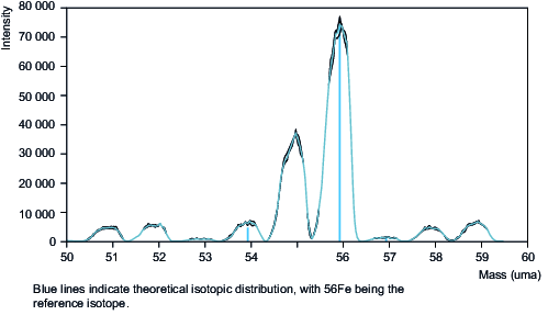 In the case of elemental analyses such as those carried out by ICP-MS, the spectra obtained are, in theory, relatively simple, since they only reflect the isotopic distributions of the elements present, i.e. approximately 210 different unit masses. This is because, in most cases, the isotopes are mono-ionized in the plasma; the mass-to-charge ratio analyzed is then comparable to the mass of the isotope. On the other hand, to a first approximation, the sensitivity of different isotopes of the same element is only proportional to isotopic abundance.