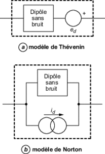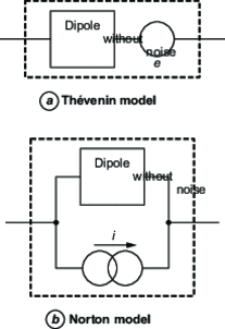 The noise of a dipole is represented either by a perfect noise current generator i d , placed in parallel with the dipole assumed to be noise-free, or by a perfect electromotive force generator e d , placed in series (Figure 9 ).